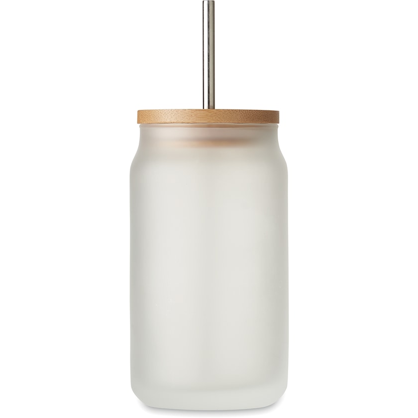 Glaskrus med logo på hele overfladen. Låget er lavet af bambus og sugerøret af rustfri stål.