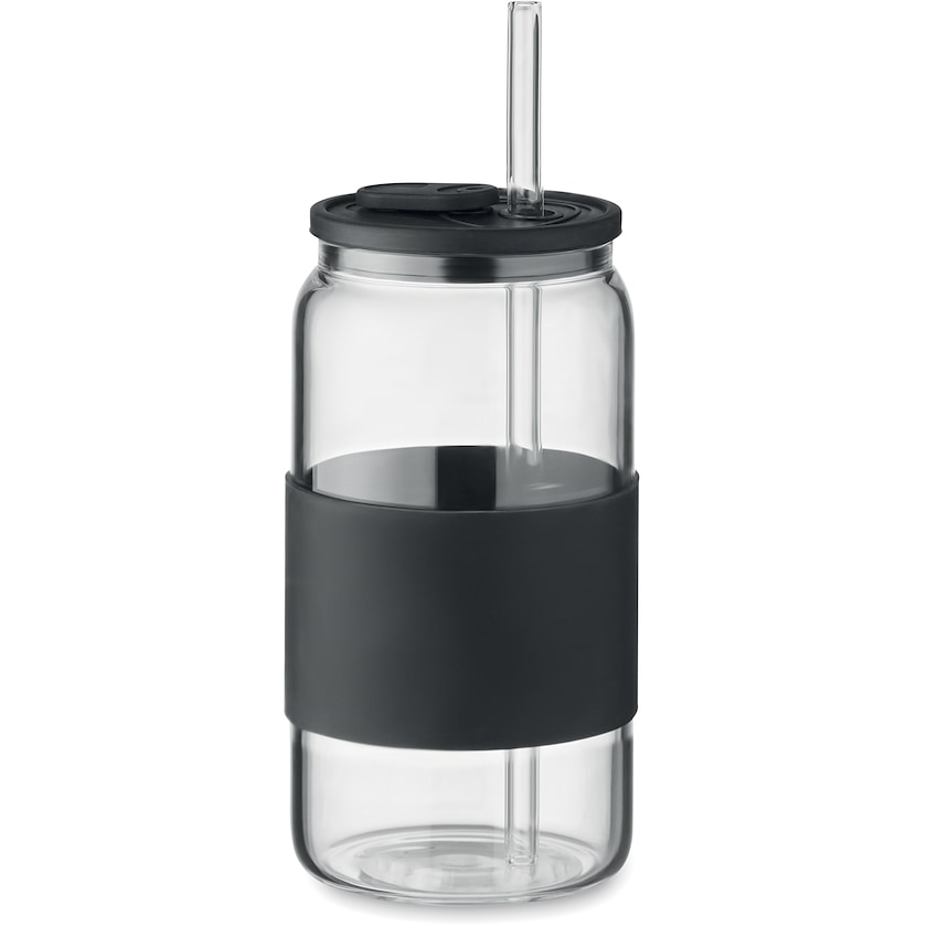 Glaskrus med låg og greb af silikone. Glaskrus, inklusiv sugerøret, er fremstillet af solidt borosilikatglas.