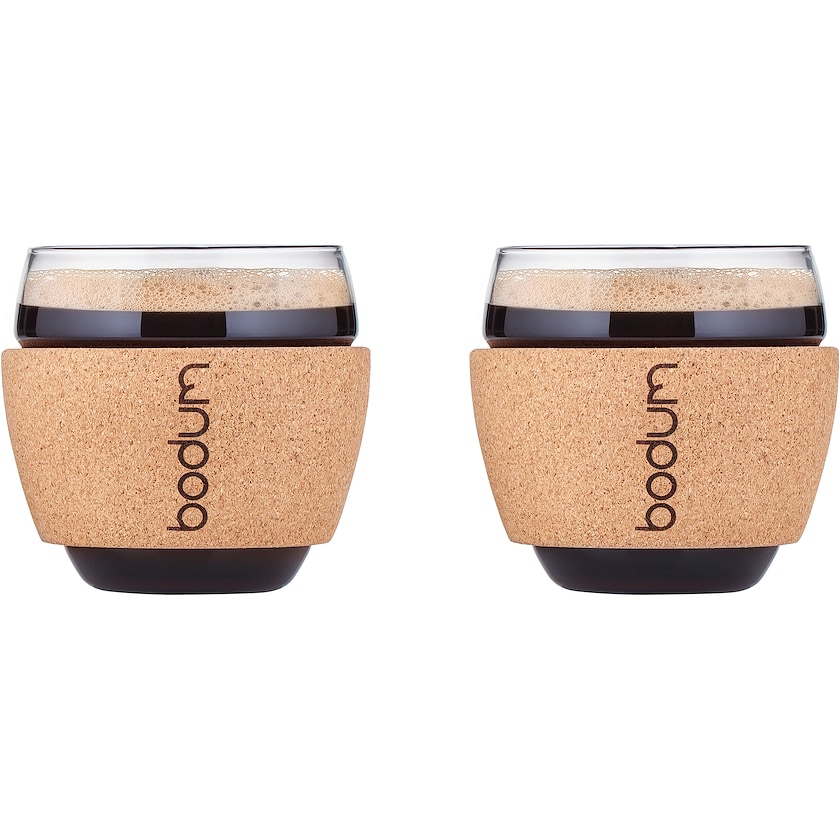 Sæt med to 35 cl glaskrus fra Bodum. Glaskrusene har en strimmel med kork rundt om kruset. Lasergraveringsprisen henviser til mærkning på det ene af krusene.
