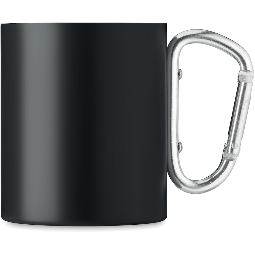 Krus af rustfri stål med karabinhage som hank. Kruset har dobbelte vægge hvilket gør at varme drikke holdes varme i lang tid.