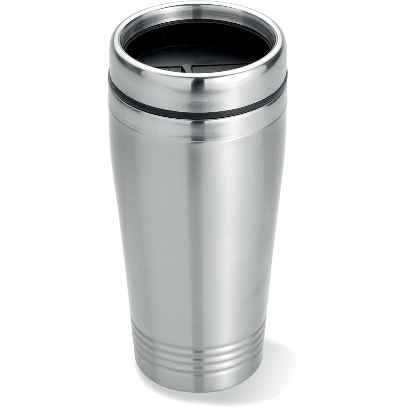 Elegant dobbeltvægget rejsekrus i metal. Kruset er fremstillet i rustfrit stål, og har et låg af polypropylen. Mærkning kan enten ske med tryk eller lasergravering.