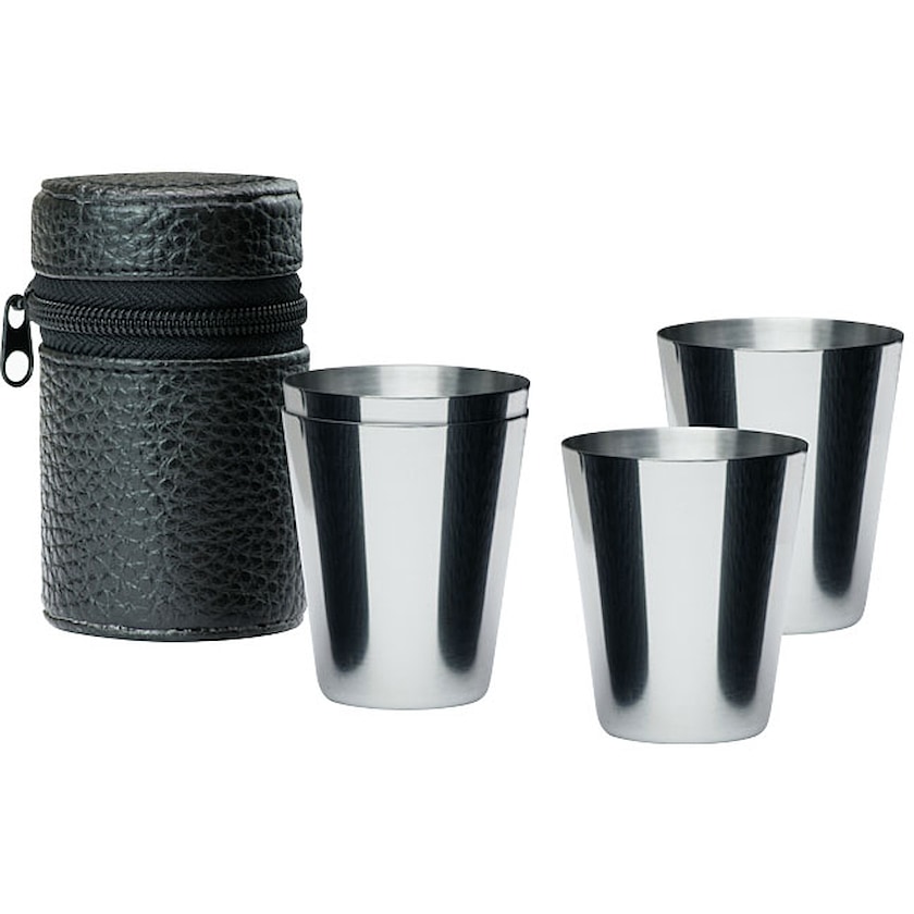 Fire metalkrus i rustfrit stål, som leveres i æske af kunstlæder. Lasergraveringspriserne omfatter lasergravering på alle fire krus.