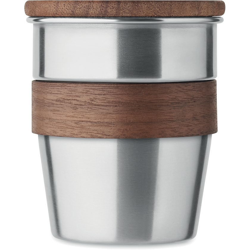 Eksklusivt krus af genanvendt rustfri stål og valnød. Kruset har enkeltvæg og er fremstillet af 90% genanvendt rustfri stål og 10% almindelig rustfri stål. Grebet bør tages af ved opvask. Eftersom kruset har enkeltvæg kan varmeoverførelse forekomme ved varme drikkevarer.