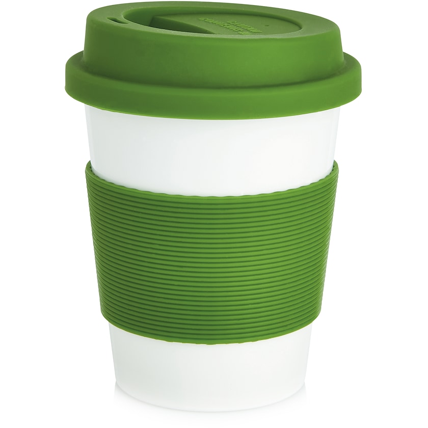 Miljøvenligt take away-krus af det biologiske nedbrydelige materiale PLA (polylactic acid). Kruset har et behageligt grep og et låg af silikone. Kruset tåler maskinvask og mikroovn (maks 120°C ).