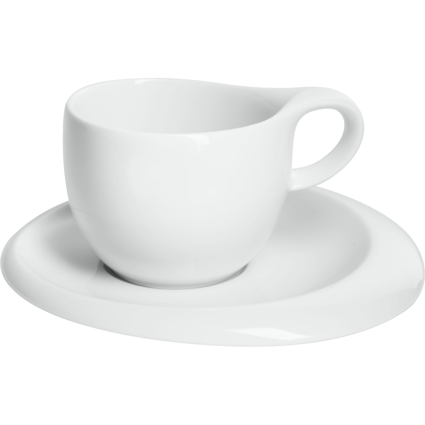 Flot designer kaffekop med underkop. Lira Café er fremstillet af blankpoleret porcelæn. Perfekt størrelse til sort kaffe eller en cappuccino.