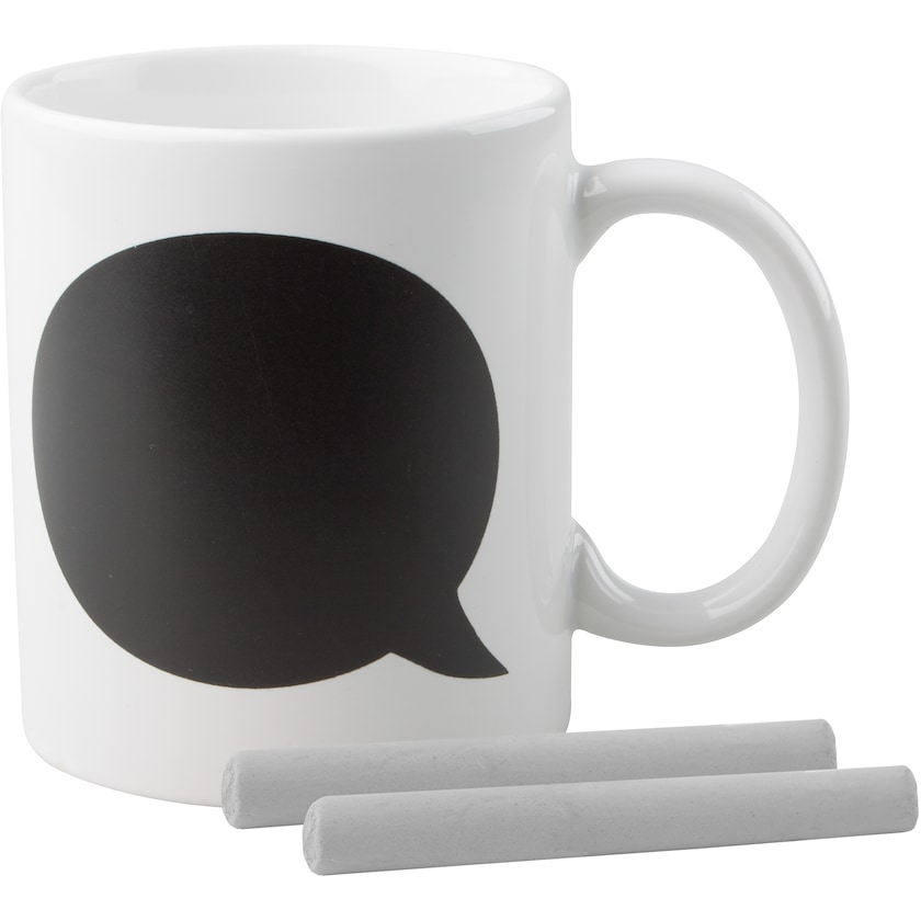 Sjovt krus med taleboble som man kan skrive i. 2 hvide tavlekridt medfølger.