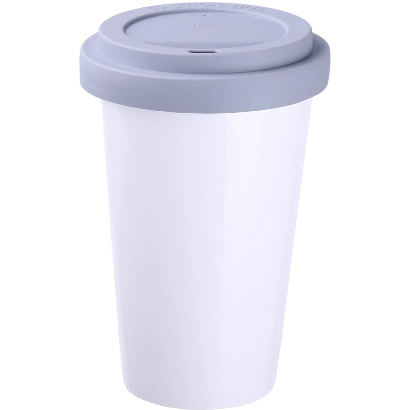 Take away-krus af porcelæn med gummilåg. Kruset har dobbelte vægge hvilket gør at drikken holdes varm i lang tid.