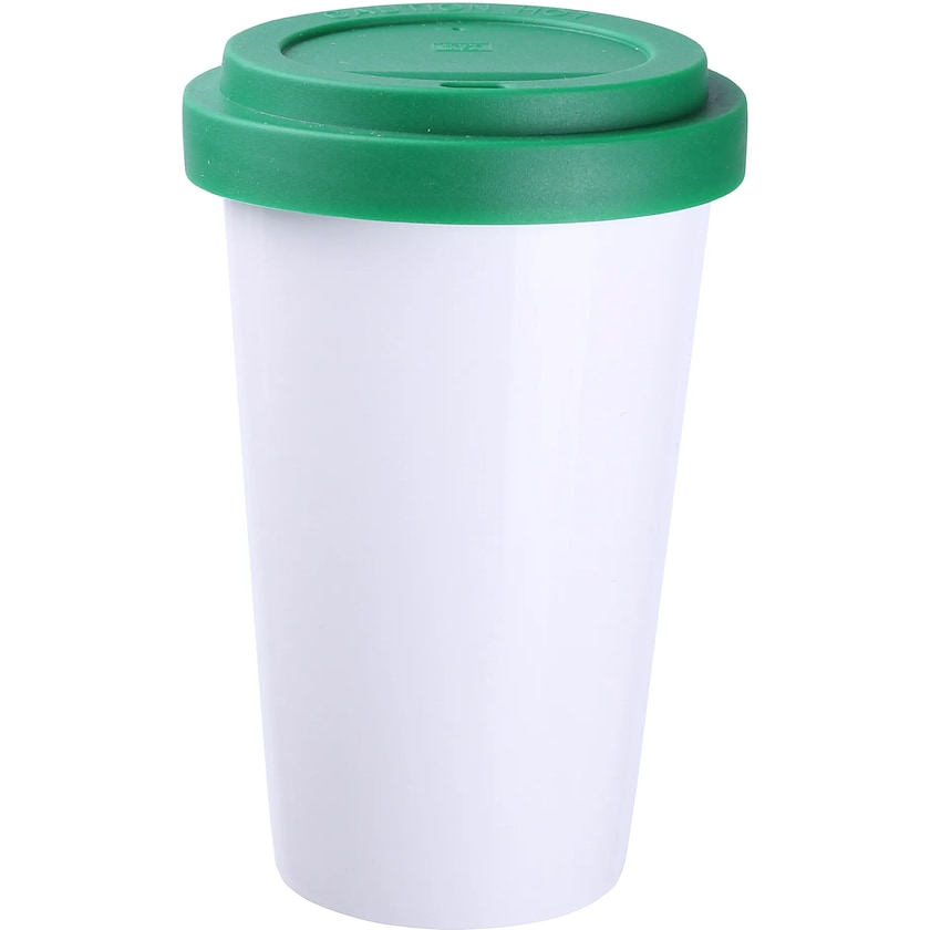 Take away-krus af porcelæn med gummilåg. Kruset har dobbelte vægge hvilket gør at drikken holdes varm i lang tid.