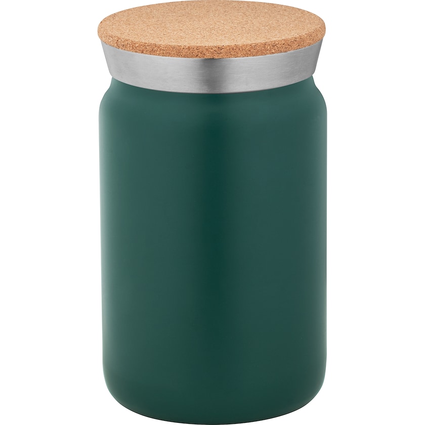 Termokrus af rustfri stål med låg af kork. Pga. vakuumisoleringen med kobber holdes drikken varm i 5 timer og kold i 24 timer. Mærkning laves enten med 1-trykfarve eller lasergravering.