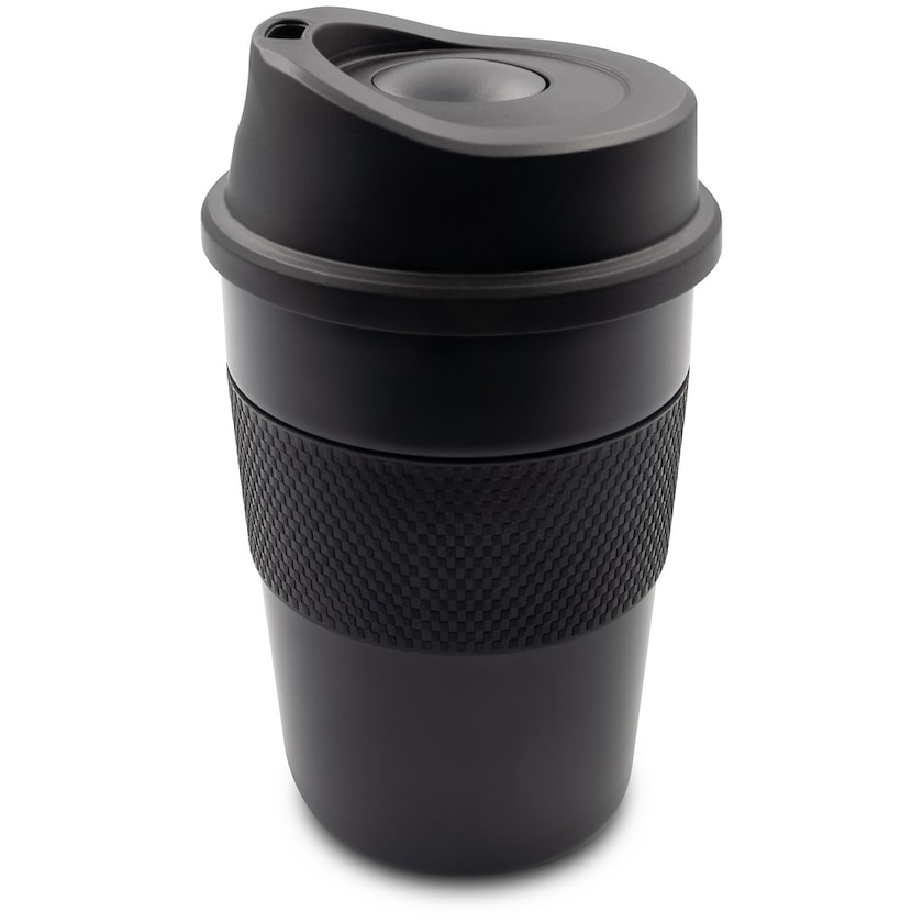 Termokrus af rustfri stål. Kruset har vakuumisolerede vægge, inder- og yderside af rustfri stål og et plastlåg med et smidigt drikkehul som kan åbnes og lukkes. Kruset har et bekvemt gummigreb omkring det.
