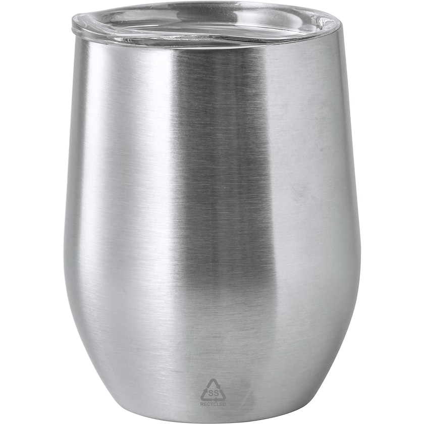 Afrundet designet termokrus af genanvendt rustfri stål. Pga. de dobbelte vægge holdes drikken varm i lang tid. Låget er lavet af plast. Foran er der et symbol som viser at kruset er lavet af genanvendt rustfri stål.