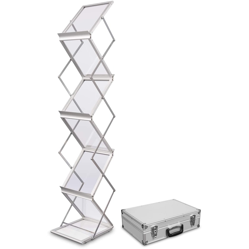 Stilfuld brochurestander af aluminium med robust opbevaringstaske. Flex Suitcase er forsynet med 6 hylder til A4-brochurer. Hver hylde måler 30,5 x 22 cm. Udfoldet måler brochurestanderen 146 cm i højden. Foldet er målene 11 x 25,6 x 40 cm. Monteringen går hurtig og kræver ingen værktøj. Leveres med en robust opbevaringstaske af aluminium. 1 års garanti.