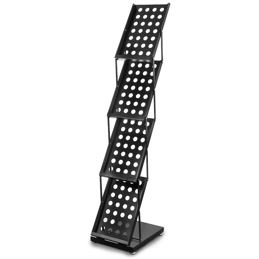 Brochurestander til A4-broschurer. Vista A4 er fremstillet af solidt metal og har en højde på 124 cm når den er udfoldet. Udfoldningen kræver ingen værktøj. Hver brochurehylde måler 30,5 x 22 cm. Udfoldet måler brochurestanderen 11 x 27 x 42 cm. Opbevaringstaske følger med. 1 års garanti.