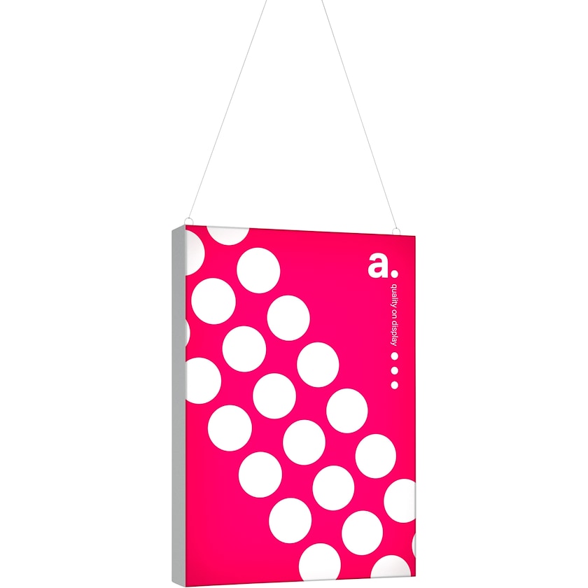 Lille lysboks som hænges op i loftet. Lysboksen er oplyst med et topmoderne system af LED-lys, der med garanti belyser hele motivet. Motivet er trykt på et polyesterstof med en specialudviklet trykmetode, der sikrer skarpe detaljer og klare farver. Motivet er placeret på begge sider af lysboksen. Når det er tid til at skifte motiv, bestiller du bare et nyt stof hos os. Installationen er hurtig og nem.