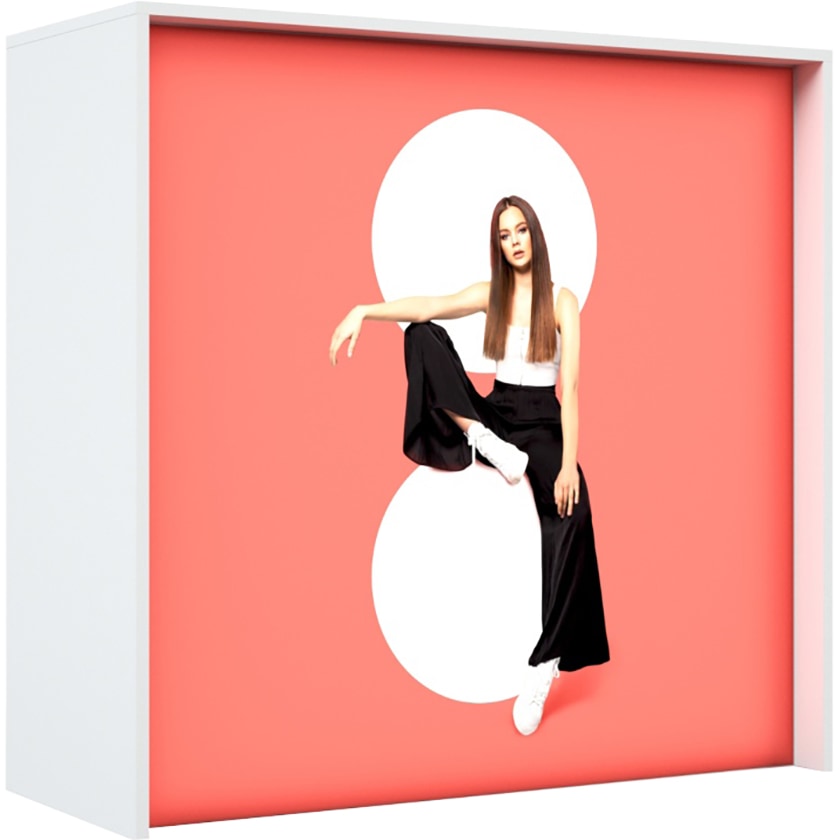 LED-oplyst messebord med eget logo. Messebordet har et smart stofgardin med LED-lys, der oplyser dit motiv. Monteringen kræver ikke noget værktøj, men montagen foregår ved at klikke delene sammen. Når du vil ændre motivet, bestiller du blot et nyt stof. Der medfølger en praktisk opbevaringstaske med hjul.