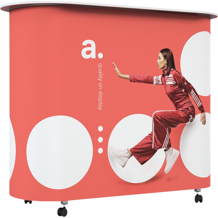 Ovalt messebord med praktiske hjul. På trods af sin størrelse er messebordet nemt at flytte. Monteringen foregår gnidningsfrit ved at klæde stoffet på bordets aluminiumskonstruktion. Ønsker du at ændre motivet, skal du blot bestille et nyt trykt stof hos os. Klarer en maksimal vægt på 100 kg.