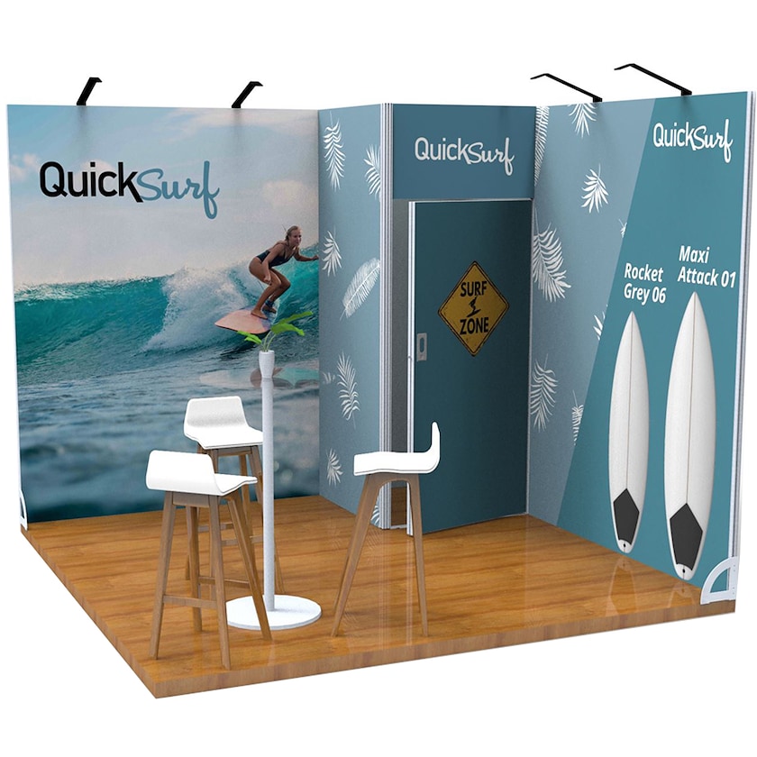 Letmonteret messestander på 9 m2. Sættet indeholder to 200 cm moduler, en modul med dør, to fødder og en opbevaringstaske. Trykket laves på et stof som strækkes udover modulernes ramme og fæstnes med silikonebånd. Modulernes rammer er fremstillet af anodiseret aluminium. Alle dele er tydeligt markeret for at muliggøre hurtig montering. Monteringen kræver ikke værktøj udover den inkluderede unbrakonøgle. Ønsker du at ændre på standernes tryk bestiller du blot nye stoffe fra os. LED-lamper og TV-stativ kan tilkøbes som tilbehør. Bord, stole samt gulv er ikke inkluderet.