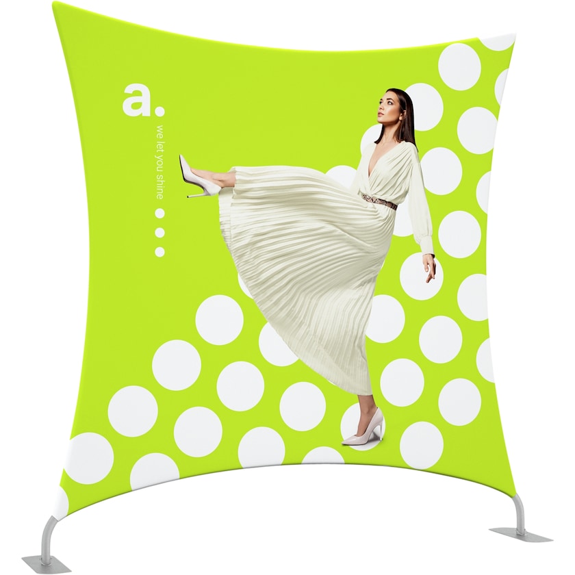 Innovativ messevæg med spændende form. Sofstar Bat 260 har en genial konstruktion af aluminiumsrør, der klikker ind i hinanden og samles i en bue. Montering kræver intet værktøj. Når bøjlen er samlet, skal du blot trække stoffet henover den og lukke med en lynlås. Stoffet er trykt med vandbaseret farve foran og bagpå. Stoffet kan maskinvaskes ved 30 grader. Ønsker du at ændre på motivet i fremtiden, skal du blot bestille et nyt stof.
