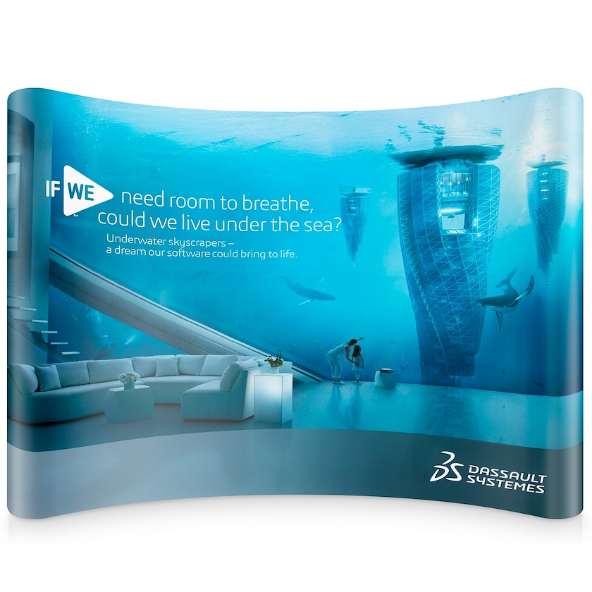 Stor messevæg med hvælvet form. Messevæg Pop Up Large monteres af kun en person og ingen værktøj behøves. Stoffet fastgøres med magnetbånd. Leveres i en praktisk opbevaringstaske med hjul. Trykket laves på forsiden samt de to korte ender.