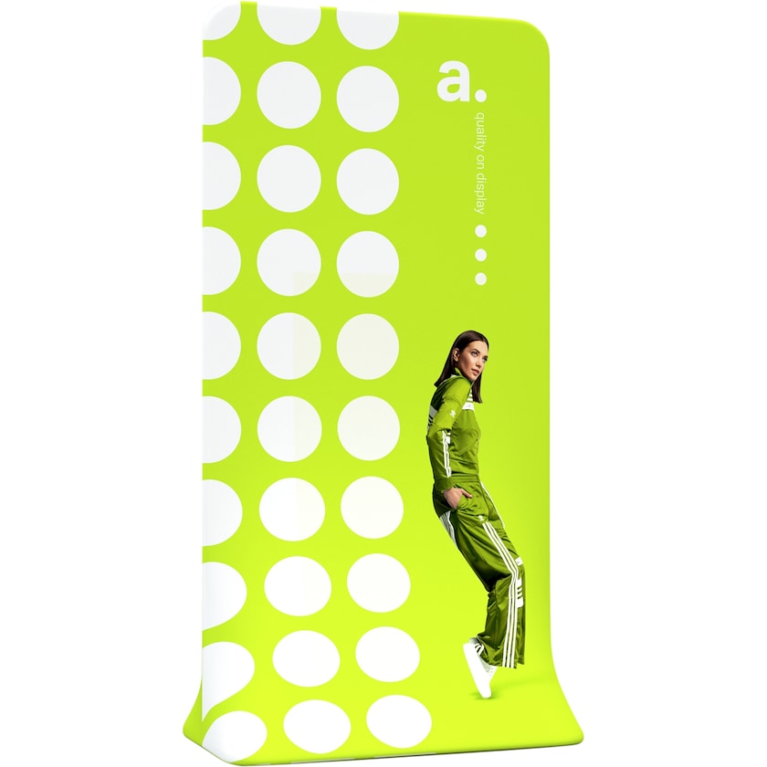 320 cm høj tårnlignende messevæg for dig som vil ses. Messevæggen har en innovativ konstruktion bestående af aluminiumsdele, der er sat sammen helt uden værktøj. Aluminiumskonstruktionen dækkes derefter med stoffet og lukkes med lynlås. Hvis du på et tidspunkt ønsker at udskifte stoffet, skal du blot bestille et nyt hos os. Stoffet kan vaskes i vaskemaskine ved 30 grader. Trykningen sker med miljøvenlige vandbaserede farver.