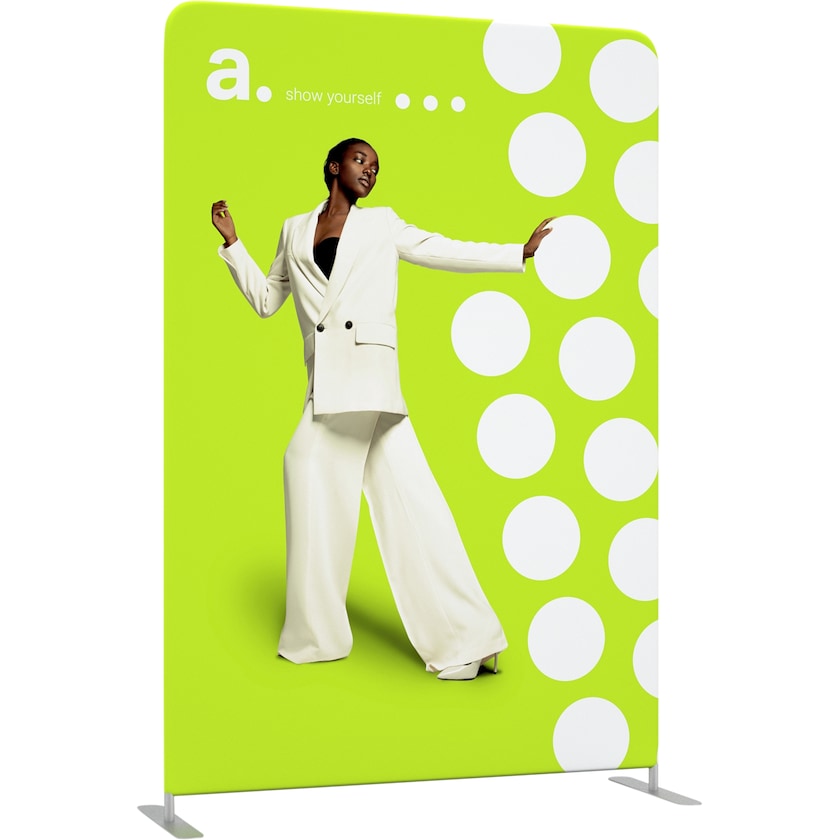 150 cm bred messevæg med logo. Messevæggen har en unik konstruktion af aluminiumsrør, der klikker sammen og danner en bue. Montering kræver ingen værktøj og er meget hurtig. Når bøjlen er samlet, trækker du bare stoffet henover, lukker med lynlås og det er færdigt. Trykket er miljøvenligt med vandbaseret farve foran og bagpå stoffet. Skulle du få brug for det, kan du vaske stoffet i vaskemaskine ved 30 grader. Når det er tid til at forny motivet, bestiller du bare et nyt stof hos os. Miljøvenlig og økonomisk!