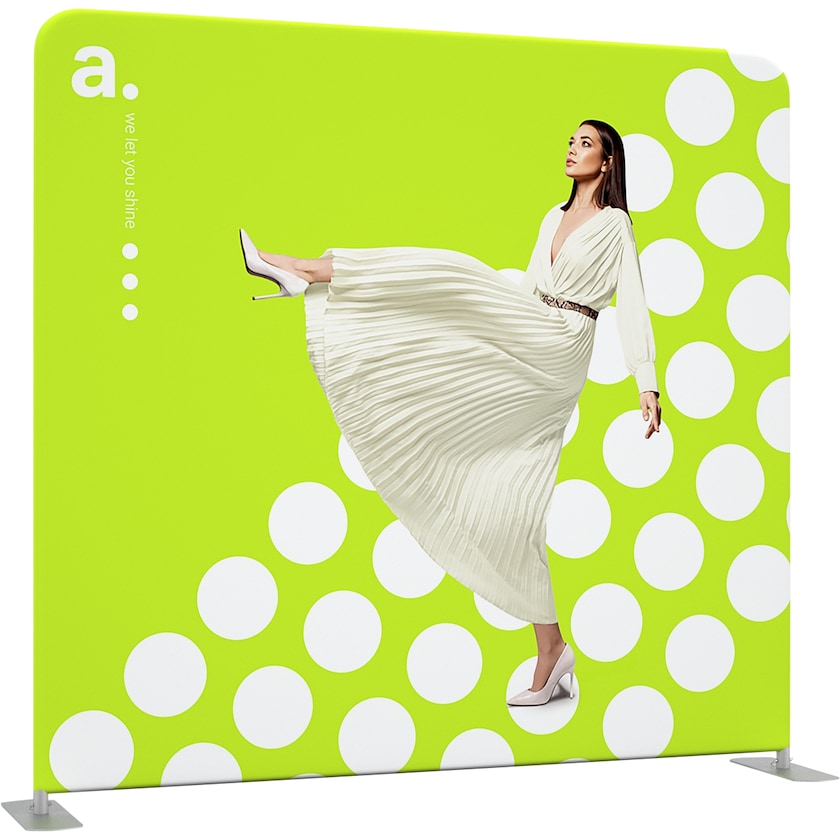 240 cm bred messevæg som er meget let at montere. Messevæggen er opbygget af aluminiumsrør, som uden værktøj kan samles i en bue. Stoffet med dit logo draperes derefter over bøjlen og lukkes med en lynlås. Resultatet er en messevæg uden folder og rynker. Trykningen sker med miljøvenlig vandbaseret farve på begge sider. Fordi udstillingsvæggen både er nem at samle og har en lav vægt, er den perfekt til spontane arrangementer og kampagner. Stoffet kan maskinvaskes ved 30 grader. Der kan tilkøbes separate stoffer, så motiverne kan ændres.