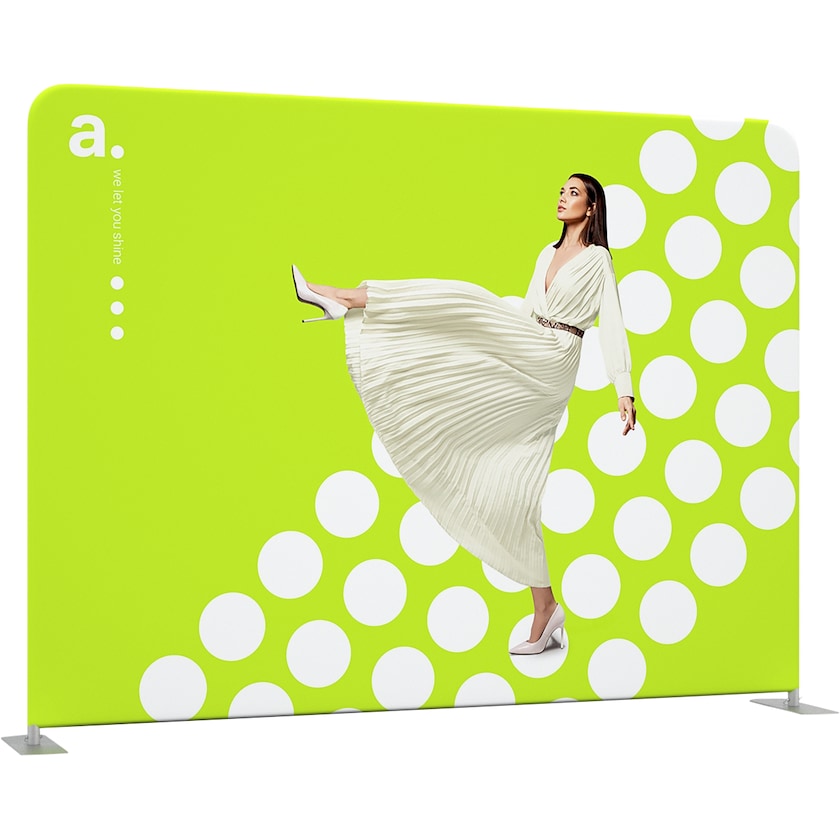 Let og letmonteret messevæg med 300 cm bredde. Messevæggen er lavet af aluminiumsrør, der uden værktøj kan samles i en bue. Stoffet, som vi leverer med dit logo, draperes derefter over rammen og lukkes med lynlås. Resultatet er en messevæg uden folder og rynker. Stoffet kan vaskes i vaskemaskine ved 30 grader. Separate stoffer kan tilkøbes, hvis det er nødvendigt, så motiverne kan ændres. Trykningen sker med vandbaseret blæk på begge sider.
