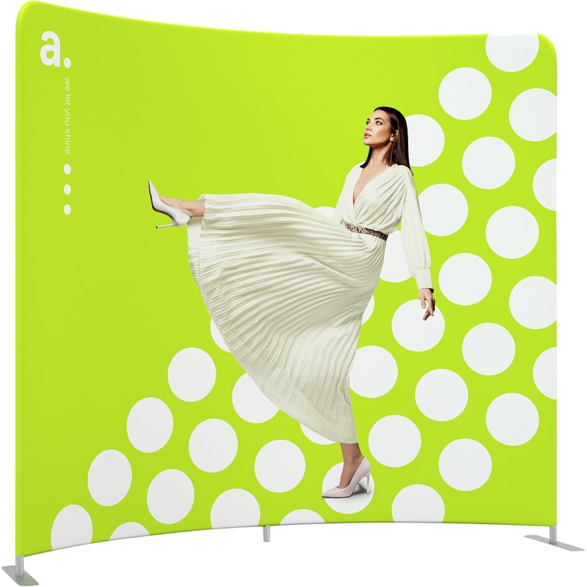 240 cm bred messevæg som er let buet. Den buede form giver messevæggen en vis 3D-effekt. Udstillingsvæggen har en moderne konstruktion af aluminiumsrør, der er samlet i en bue. Montering kræver intet værktøj og er hurtig. Stoffet med dit logo trækkes derefter over bøjlen og lukkes med en lynlås. Denne smarte konstruktion giver en rynkefri messevæg uden folder. Stoffet er trykt miljøvenligt med vandbaseret farve på både for- og bagside. Skal du vaske stoffet, kan det køres i vaskemaskine ved 30 grader. Ønsker du at udskifte motivet, skal du blot bestille et nyt trykt stof hos os.