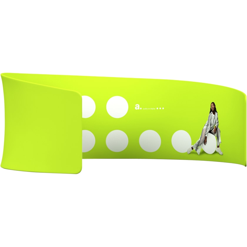 Stor afrundet messevæg med hele 650 cm bredde. Den runde form skaber en flot rumlignende overflade. Takket være en smart konstruktion af aluminiumsrør, der klikker ind i hinanden, kan udstillingsvæggen samles helt uden værktøj. Efter du har samlet aluminiumsrørene i en bøjle, trækker du blot stoffet henover bøjlen og lukker med en lynlås. Stoffet er trykt med miljøvenlig vandbaseret farve foran og bagpå. Stoffet kan maskinvaskes ved 30 grader. Hvis du nogensinde vil ændre motivet, skal du bare bestille et nyt stof.