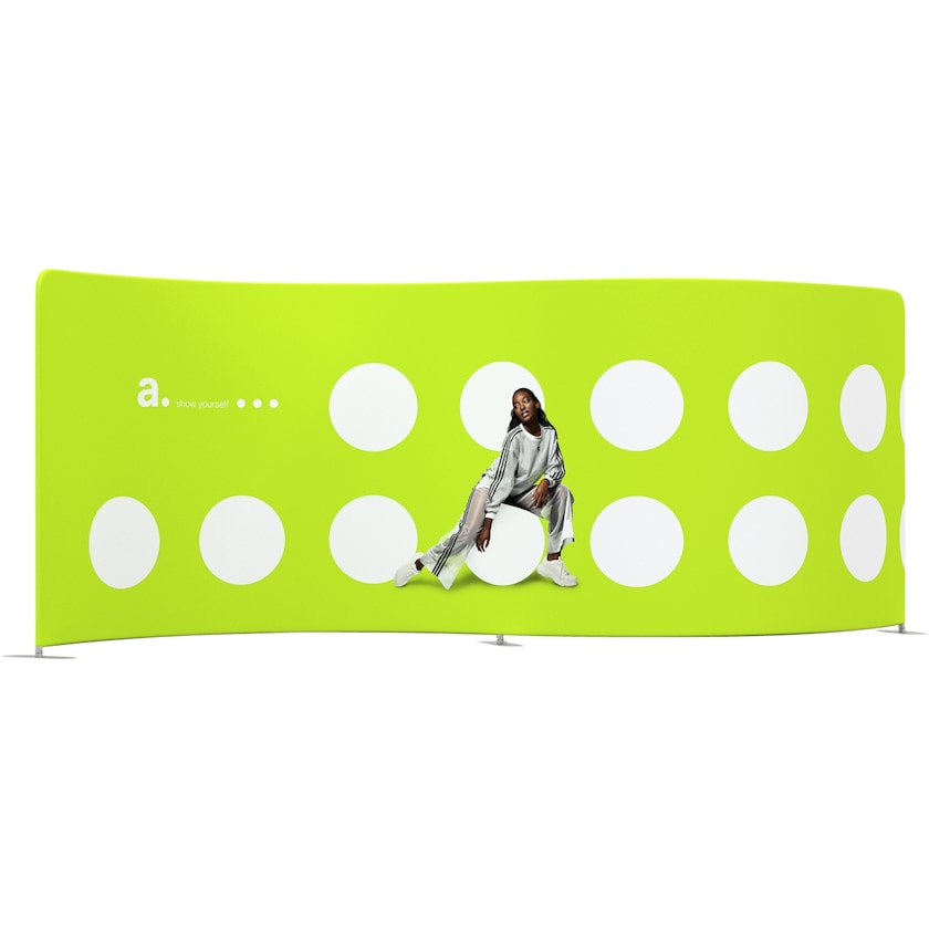 En hele 600 cm bred messevæg med slangeform. Messevæggen har en let bølgende form, der skaber opmærksomhed blot ved sin interessante form! Konstruktionen består af aluminiumsrør, der er samlet i en bue helt uden værktøj. Stoffet, som vi leverer med dit logo, trækker du henover bøjlen og lukker med lynlås. Smart og glat! Stoffet er trykt med vandbaseret farve på begge sider. Om nødvendigt kan stoffet vaskes i vaskemaskine ved maks. 30 grader. Hvis du på et tidspunkt i fremtiden ønsker at forny motivet, bestiller du bare et nyt stof hos os.