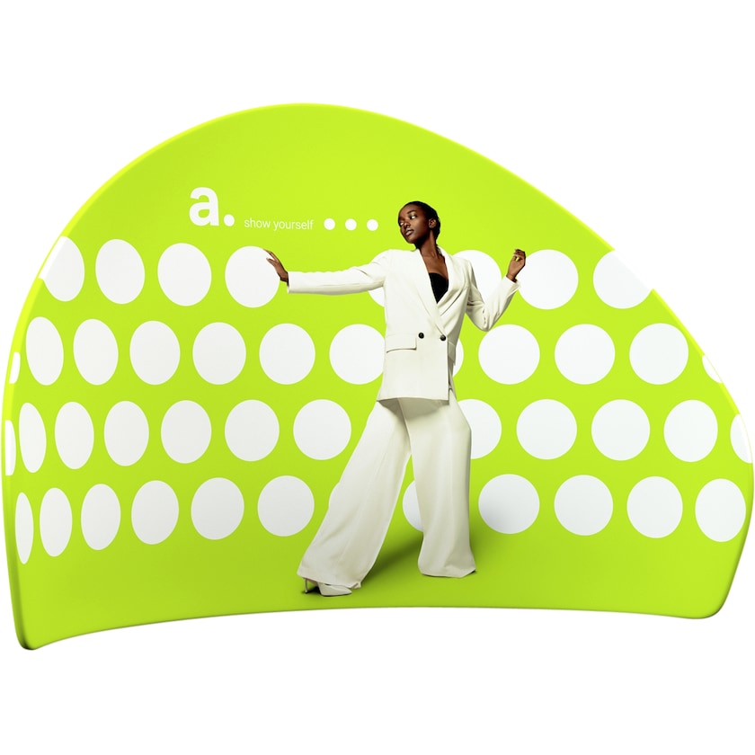 Blød formet messevæg med 330 cm bredde. Messevæggen har en smuk form, der passer i de fleste sammenhænge. Udstillingsvæggens konstruktion består af aluminiumsrør, der er samlet i en bue. Dette gøres helt uden værktøj. Stoffet, som vi leverer med dit logo, trækker du over bøjlen og lukker med lynlås. Trykket er lavet med miljøvenlig vandbaseret farve på både for- og bagside. Om nødvendigt kan stoffet vaskes i vaskemaskine ved maks. 30 grader. Vil du have flere forskellige motiver? Intet problem! Bare bestil endnu et trykt stof hos os.