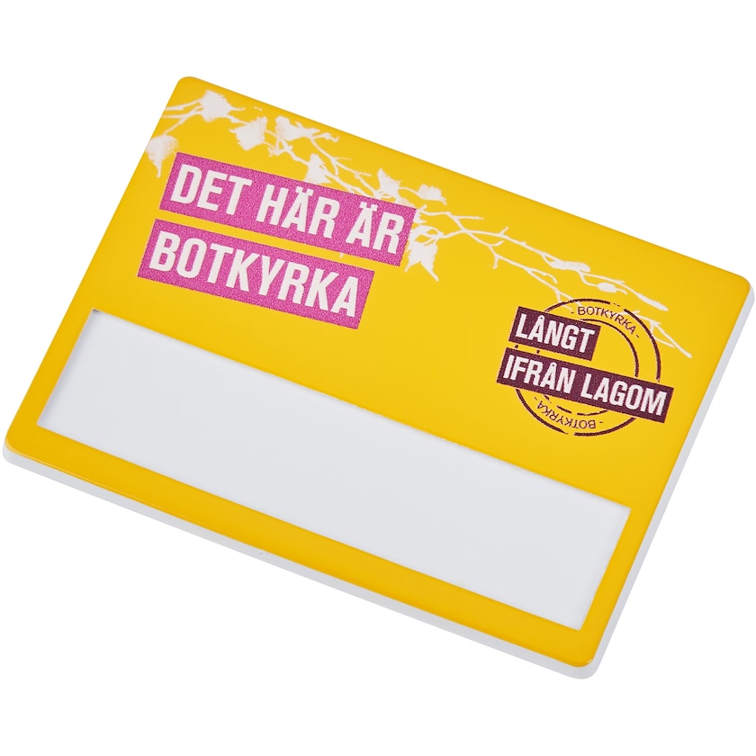 Navneskilt med en stor trykflade. Village har en sikkerhedsnål på bagsiden og findes i flere farver.