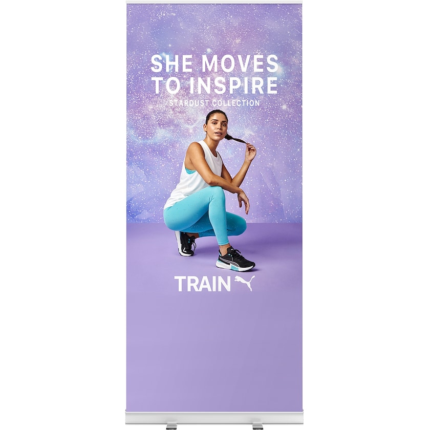 Rollups med forstærket konstruktion med øget stabilitet. Kassetten og benene er forstærket, hvilket gør roll-up'en tungere og mere stabil. Den medfølgende taske er også lavet af højere kvalitet og med mere polstring. Stoffet er Blockout PET 330 g/m², som er et førsteklasses stof med en blød, mat overflade, der blokerer lys og giver perfekt farvegengivelse. Trykningen sker digitalt med avanceret UV LED-teknologi og økologiske farver fremstillet i Europa. Konstruktionen er forstærket og lavet af anodiseret aluminium. Stoffet har dimensioner på 200 x 85 cm. Leveres med en taske med ekstra polstring. 1 års garanti.