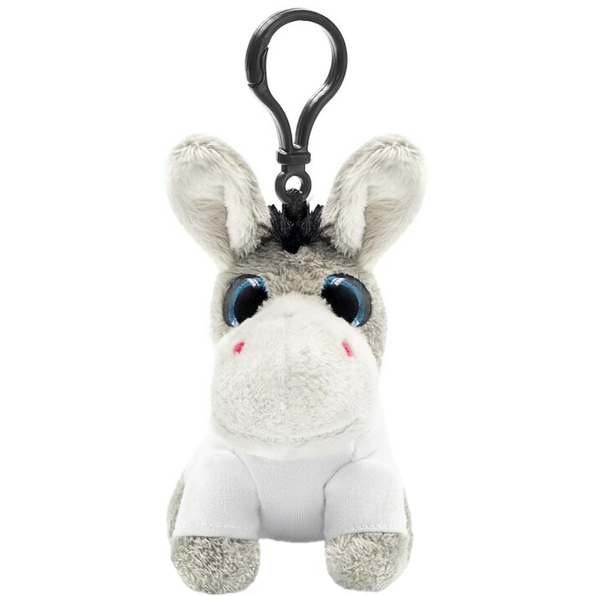 Et supernuttet æsel. Æslet er iklædt en hvid t-shirt. Den store plastikkrog gør at bamsedyret nemt kan fastgøres til en taske eller rygsæk.