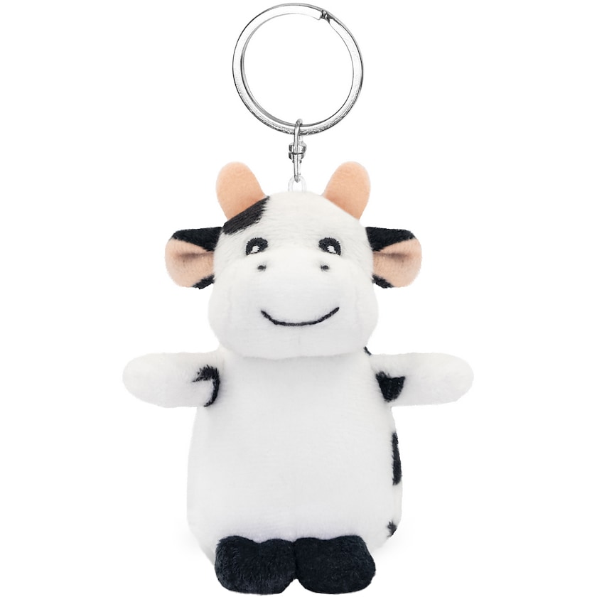 En glad og krammevenlig ko med nøglering. Trykket laves på maven.