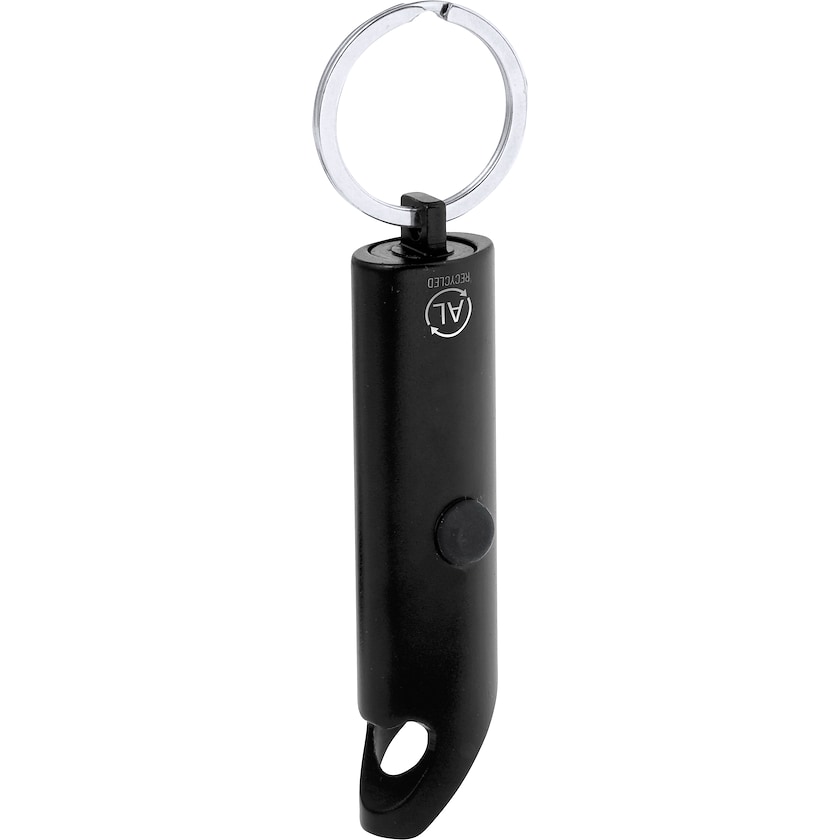 Lille LED-nøglering af genanvendt aluminium. Fungerer også som oplukker. Trykket kan maksimalt laves i to farver.