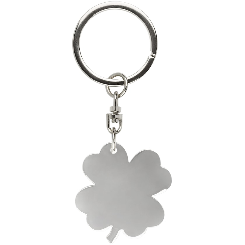 Nøglering af forkromet metal i form af et firkløver. Leveres individuelt indpakke i sort gavekarton.