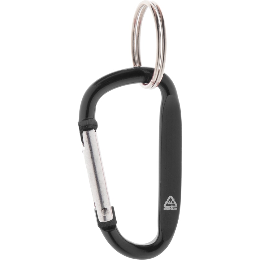 Karabinhage i genanvendt aluminium. Springringen er af metal. En unik nøglering som får tankerne til sport og friluftsliv. Karabinhagen er ikke beregnet til klatring.