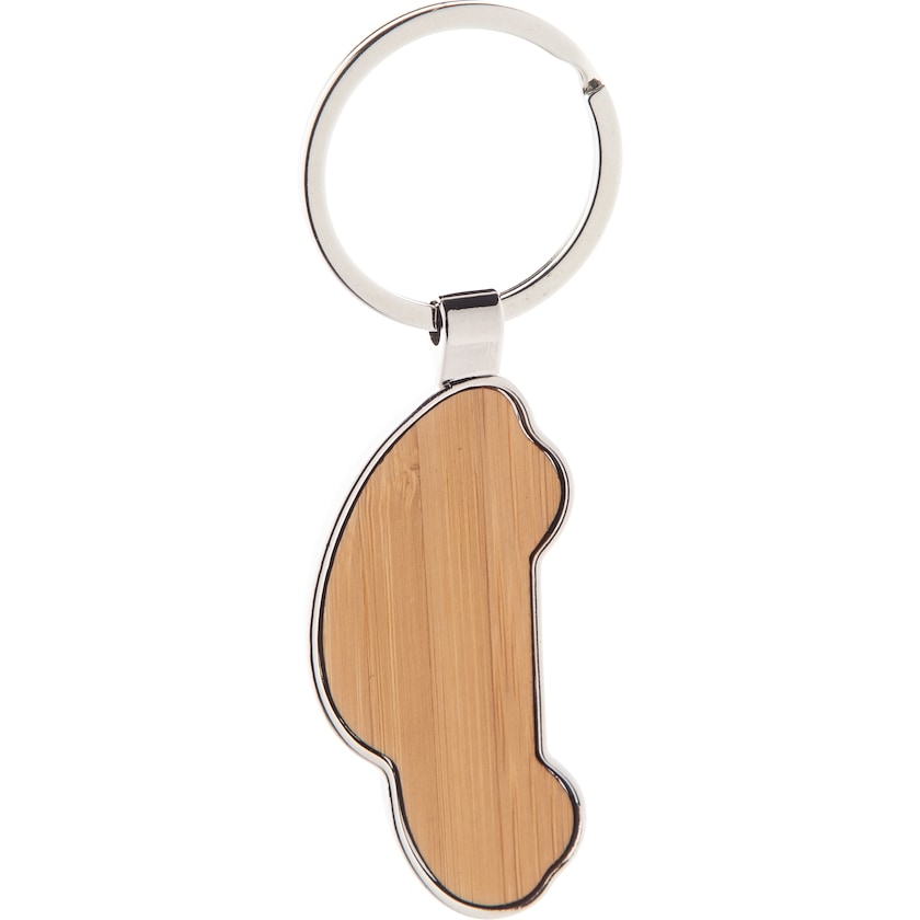 Nøglering af metal og bambus formet som en bil. Leveres stykvis pakket i en naturfarvet papæske.