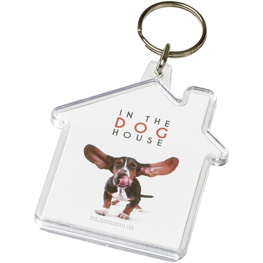 Miljøvenligt husformet nøglering med eget logo. Den er fremstillet i det miljøvenlige materiale GPPS. Trykket laves på begge sider på et papir som placeres indenfor GPPS-plastikhylsteret. Trykket kan laves forskelligt på begge sider. Nøgleringen er fremstillet i Europa.
