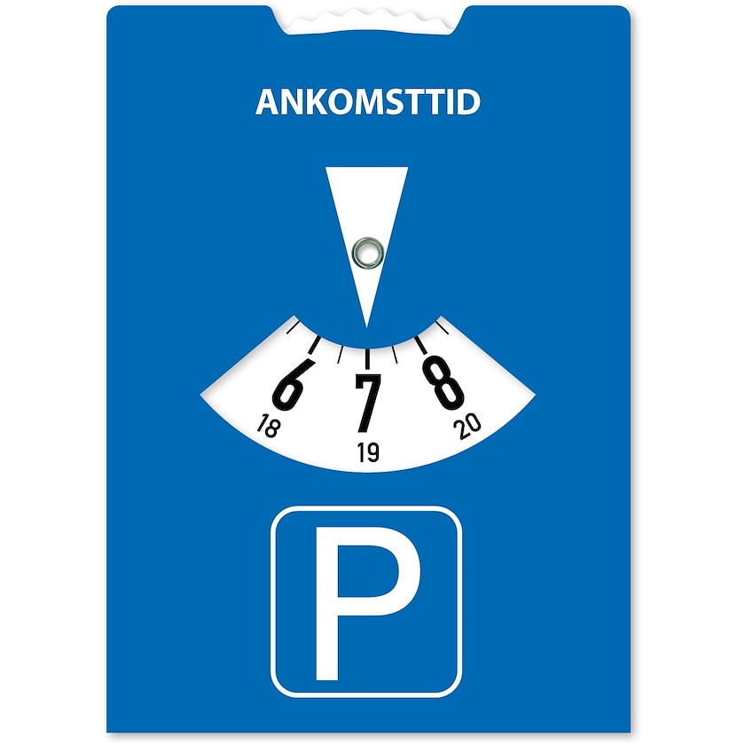 P-skive som angiver opladningstid for elbiler. Forsiden er præcist som en alm. p-skive og på bagsiden vises estimeret opladningstid. Begge sider trykkes helt efter dine ønskemål så du kan selv designe dem præcist som du vil have dem.