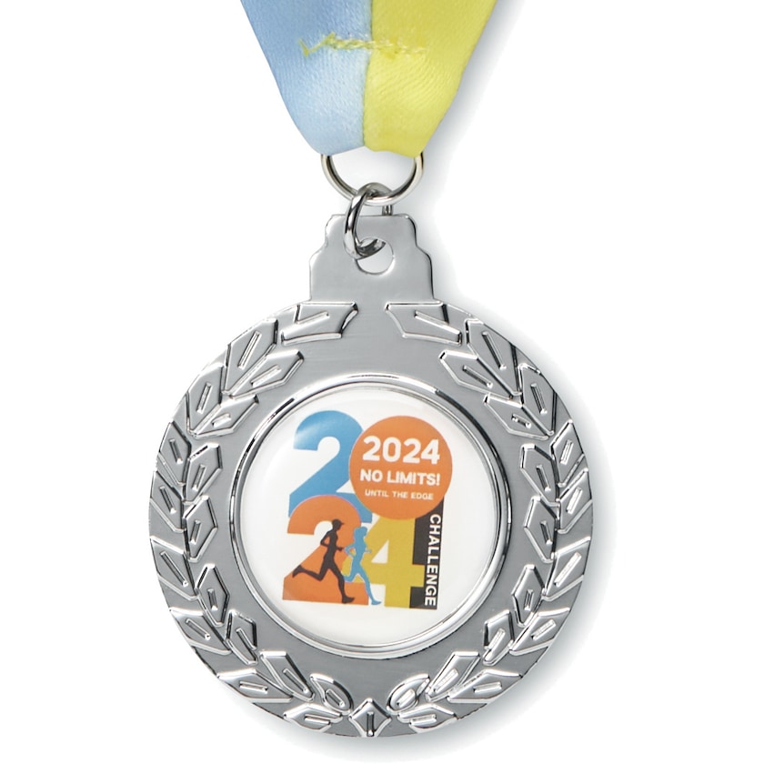 Medalje i standardform med midte med eget logo. Trykket laves med digitaltryk og beskyttes af et epoxylag. Metallet kan være i guld-, sølv- eller bronzefarve. Bandet er 80 cm i længden og begge sider kan forsynes med dit tryk.