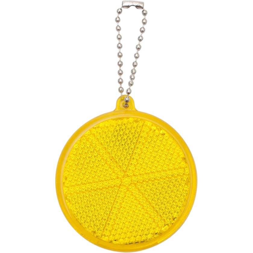 Rund refleksbrikke med lænke i metal. Hæng den på rygsækken eller på jakken. Em reklamegave til de små og de store!
