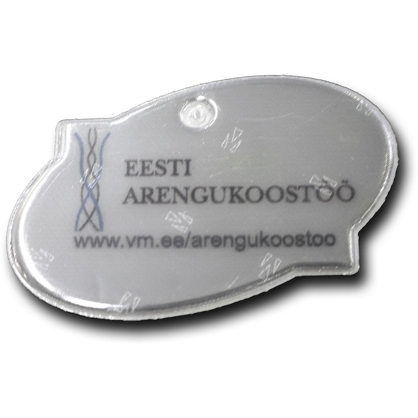 Refleks designet som en taleboble. Reflekserne bliver enten leveret med snøre samt sikkerhedsnål eller kugleled. Refleksmaterialet opfylder EN13356:2001. For ikke at minimere refleksens ydeevne, bliver dit tryk placeret under selve refleksoverfladen.