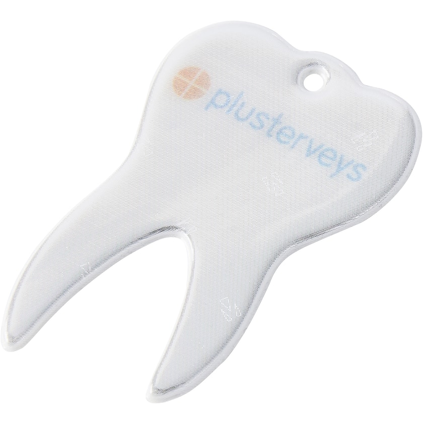 Blød refleks udformet som en tand. Perfekt til tandlæger! Reflekserne bliver enten leveret med snøre og sikkerhedsnål eller kugleled. Refleksmaterialet opfylder alle kravene i henhold til EN13356:2001. For ikke at minimere refleksens ydeevne, bliver trykket placeret under selve refleksoverfladen.