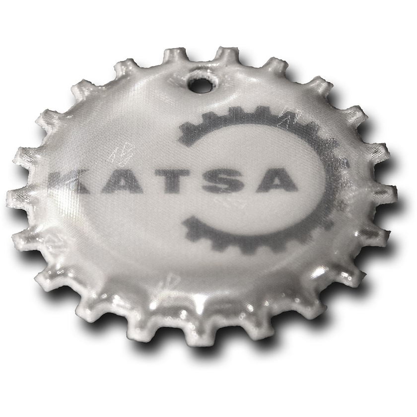 Blød refleks udformet som et tandhjul. Refleksmaterialet kan enten fås i hvid eller gul farve. Leveres enten med snøre og sikkerhedsnål eller kugleled. Refleksmaterialet opfylder alle kravene i henhold til EN13356:2001. For ikke at minimere refleksens ydeevne, bliver trykket placeret under selve refleksoverfladen.