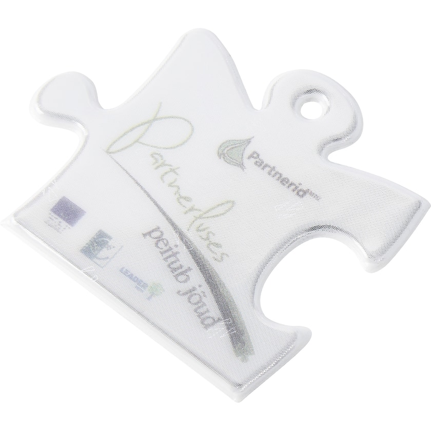 Sjov blød refleks udformet som en puslespilsbrik. Blød puslebrik refleks leveres enten med snøre og sikkerhedsnål eller drejeled. Refleksmaterialet, som kan fås i hvid eller gul farve. Refleksmaterialet opfylder alle kravene for EN13356:2001. Trykket sker under refleksoverfladen for ikke at minimere refleksens ydeevne.