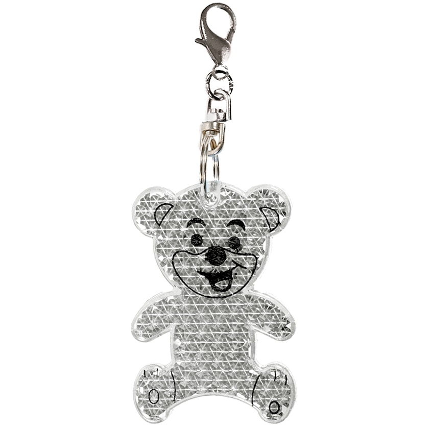 Hård refleks formet som en bamse. Refleksen er forsynet med en karabinhage, så at den let kan fæstes til f.eks. en rygsæk.