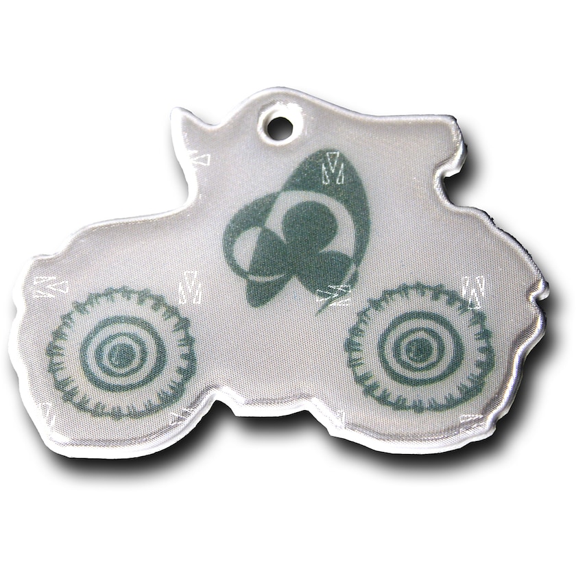 Blød refleks udformet som en traktor. Alle landmænds favorit. Leveres med snøre og sikkerhedsnål eller kugleled. Refleksmaterialet, som enten kan fås i hvid eller gul farve, opfylder alle kravene i henhold til EN13356:2001. For ikke at minimere refleksens ydeevne, bliver trykket placeret under selve refleksoverfladen.
