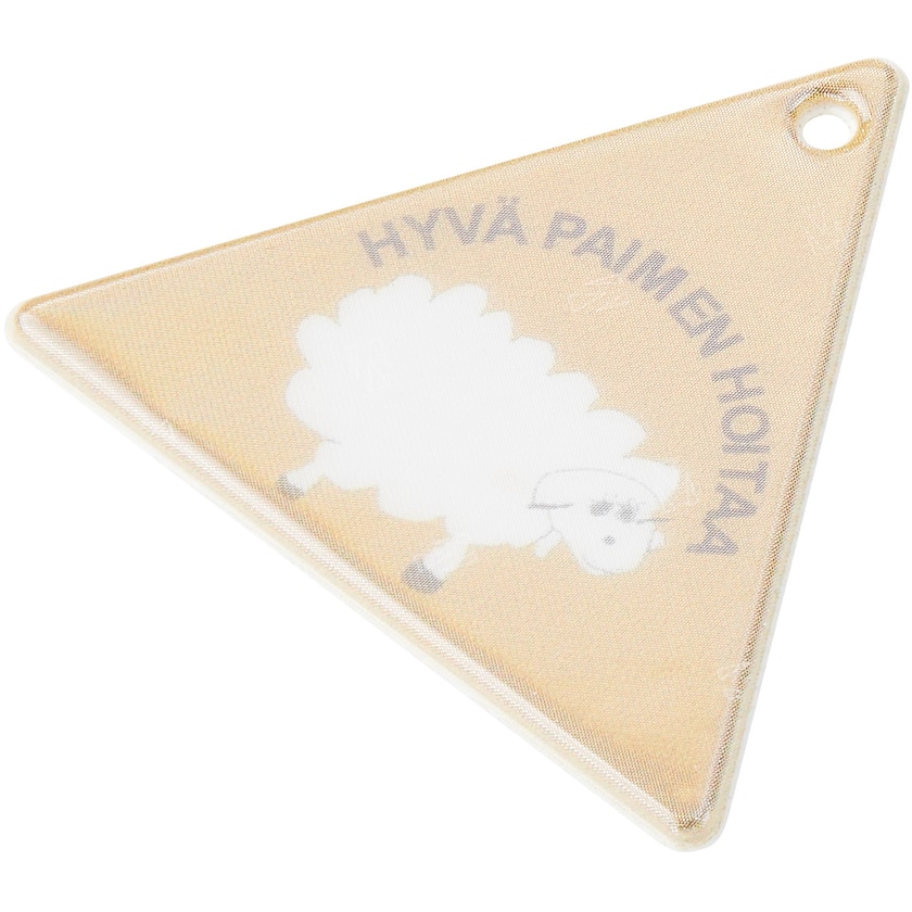 Trekantet refleks af blødt refleksmateriale. Refleksen fås enten med snøre og sikkerhedsnål eller kugleled. Refleksmaterialet opfylder kravene i EN13356:2001. For ikke at minimere refleksens ydeevne, bliver trykket placeret under selve refleksoverfladen.